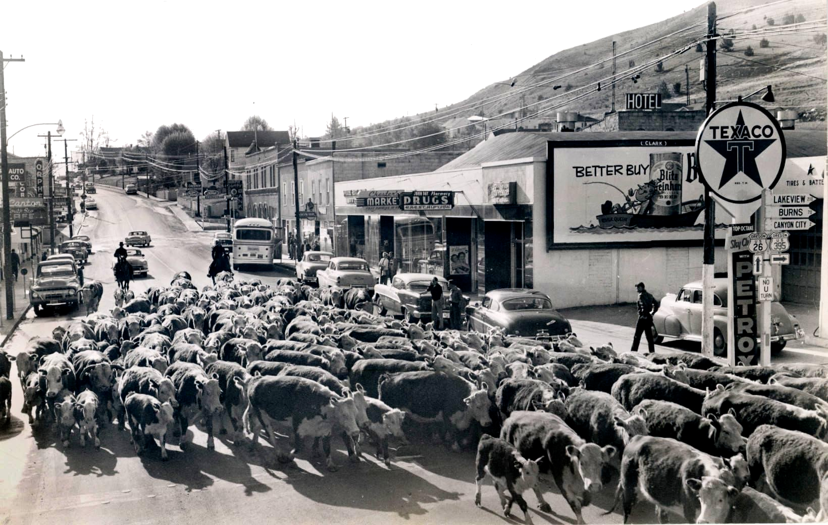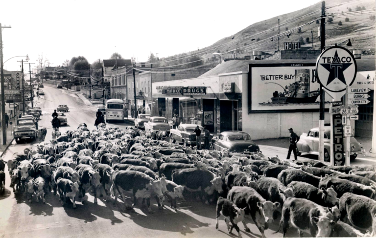 The first homestead staked in Grant County (what was then Wasco County), in 1862 by B. C. Trowbridge, was within the limits of the present city of John Day. The community was not as quick to grow as neighboring Canyon City, which was the county seat and center of the bustling mining industry in the area. Incrementally, local merchants and residents began relocating to John Day primarily each time after severe fires in Canyon City: the Grant County Courthouse burned in 1870, Chinatown burned in 1885, and fires in 1898 and 1937 devastated Canyon City’s downtown.
