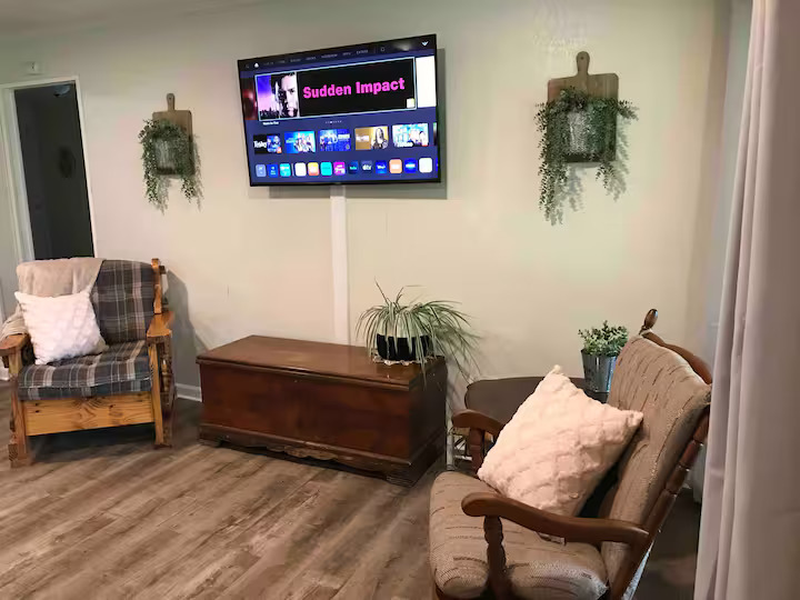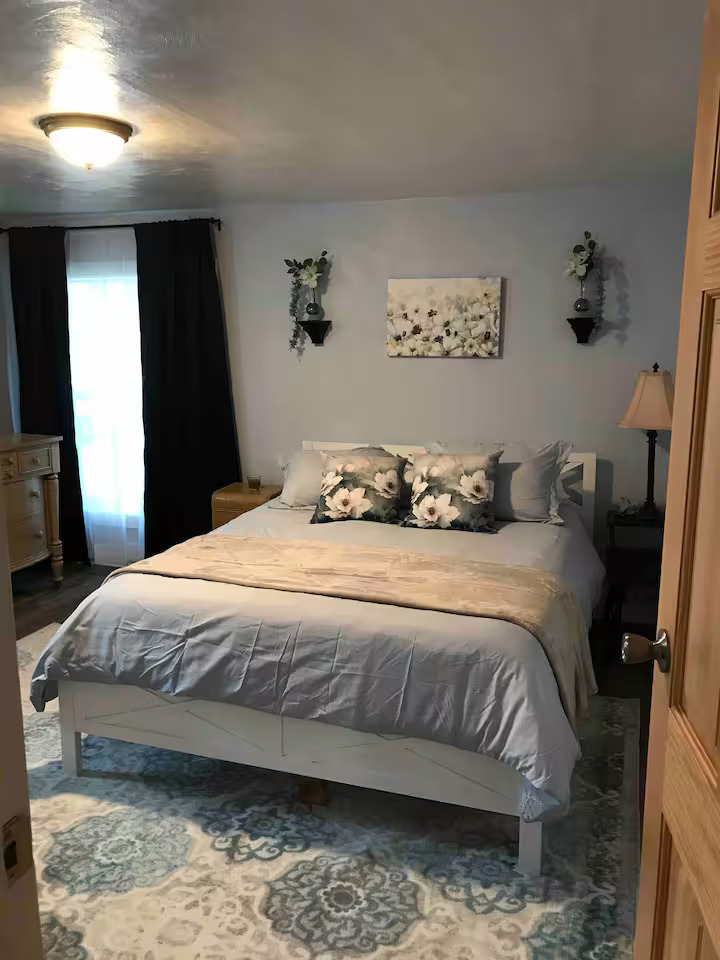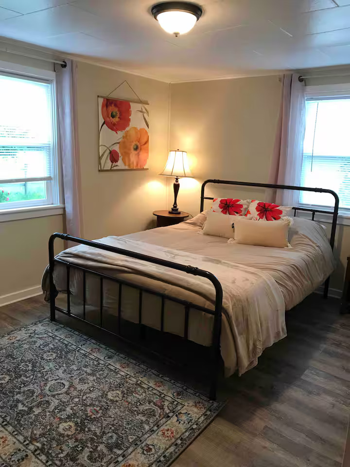 Forget your worries in this spacious and serene space. The farmhouse will make you feel right at home. Has fast WiFi for those that want to connect. There is an older rock patio to enjoy the evenings grilling and maybe a competitive game of mini corn hole. The sweet retreat has the privacy you want and the abundance of surrounding recreation that will make your stay memorable. With 3 queen beds there is room to sleep 6 comfortably.